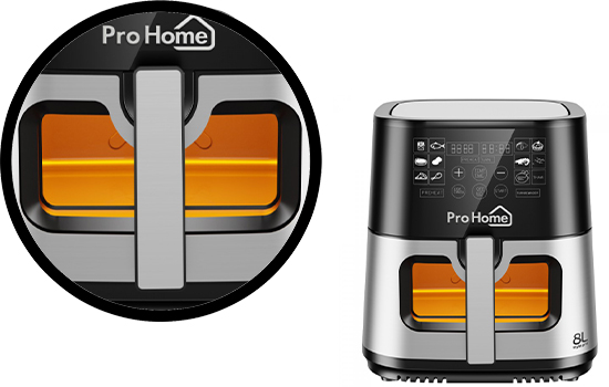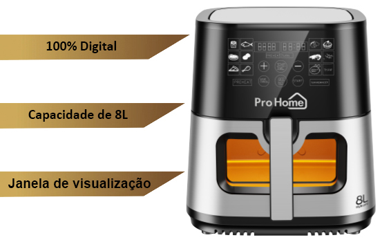 A Air Fryer Pro Home Style PRO foi desenvolvida para quem valoriza uma cozinha moderna, eficiente e cheia de estilo. Com 8 litros de capacidade, visor frontal transparente e luz interna, ela oferece praticidade, alta performance e um visual sofisticado em cada preparo. Ideal para famílias grandes e receitas elaboradas, ela une tecnologia de ponta com um design funcional e elegante.