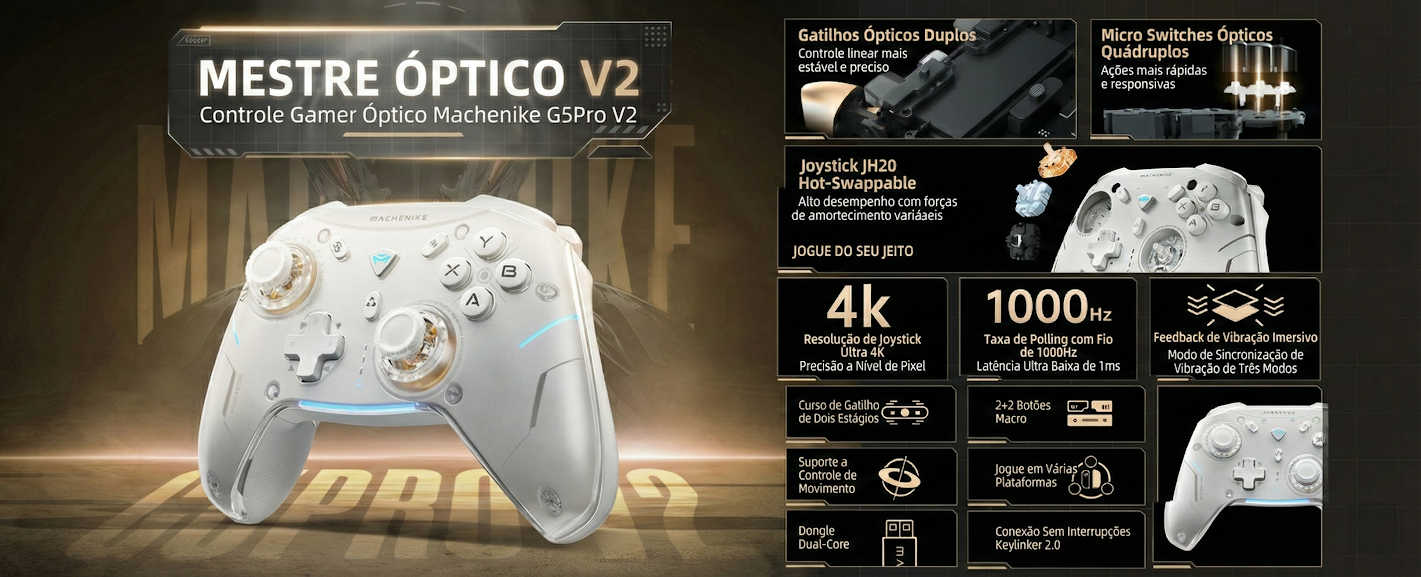 Controle Gamer Machenike G5 Pro V2 reúne performance competitiva, Polling hate 1000hz e design impactante com tecnologia óptica de última geração.