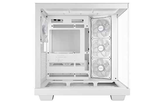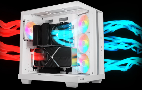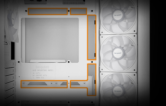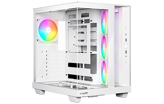O Light Base 500 conta com 4 ventoinhas Pure Wings 3 pré-instaladas . A ventoinha de exaustão traseira é uma Pure Wings 3 PWM de 120 mm, e as ventoinhas de admissão laterais são ventoinhas Pure Wings 3 PWM de 120 mm com pás invertidas. Todas as ventoinhas são otimizadas para o máximo fluxo de ar, reduzindo simultaneamente as turbulências geradoras de ruído com suas pás de formato especial. As pás invertidas garantem que seu lado bonito esteja sempre visível.